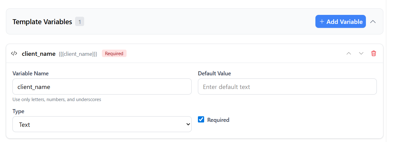 Template variables let you create dynamic, reusable documents that automatically personalize content each time you use them. Instead of editing templates manually for each client, you define placeholders that get filled in when creating a signing session.